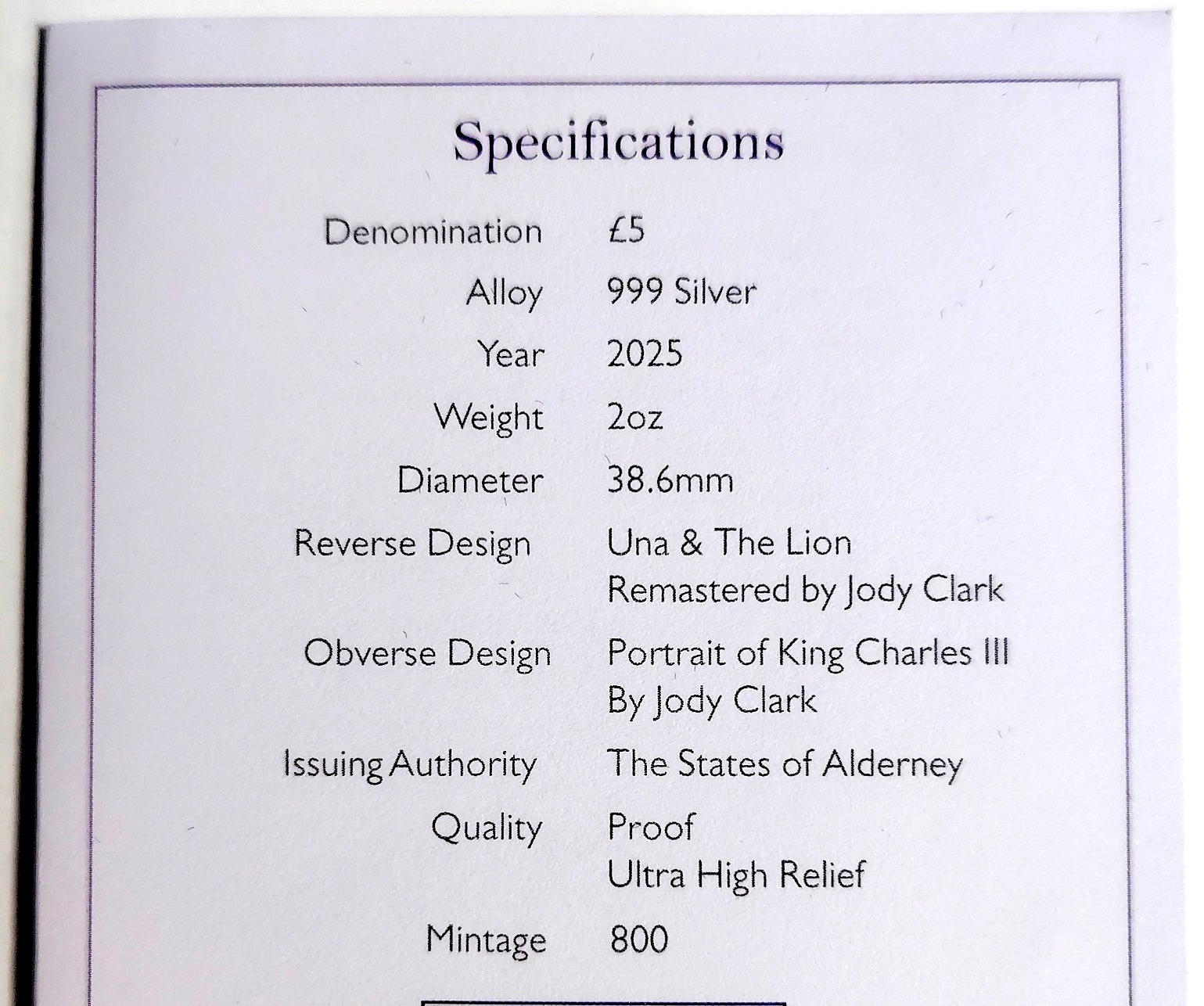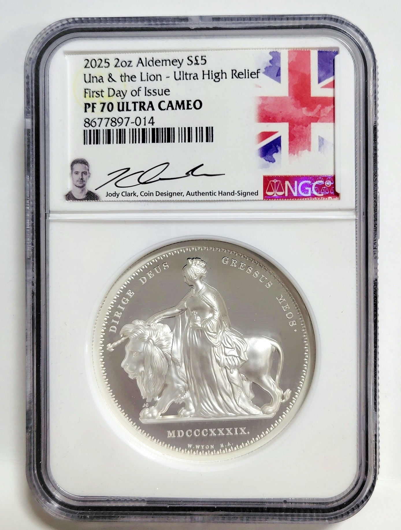 2025年 オルダニー ウナとライオン 5ポンド 2オンス ウルトラハイレリーフ プルーフ 銀貨 NGC PF70 ULTRA CAMEO First Day of Issue