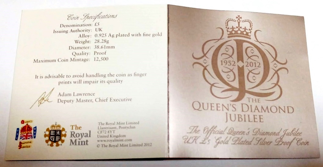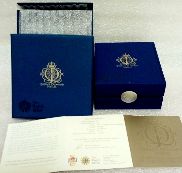 2012年ダイヤモンドジュビリー5ポンド金貨と同じデザインの純金メッキ銀貨です。