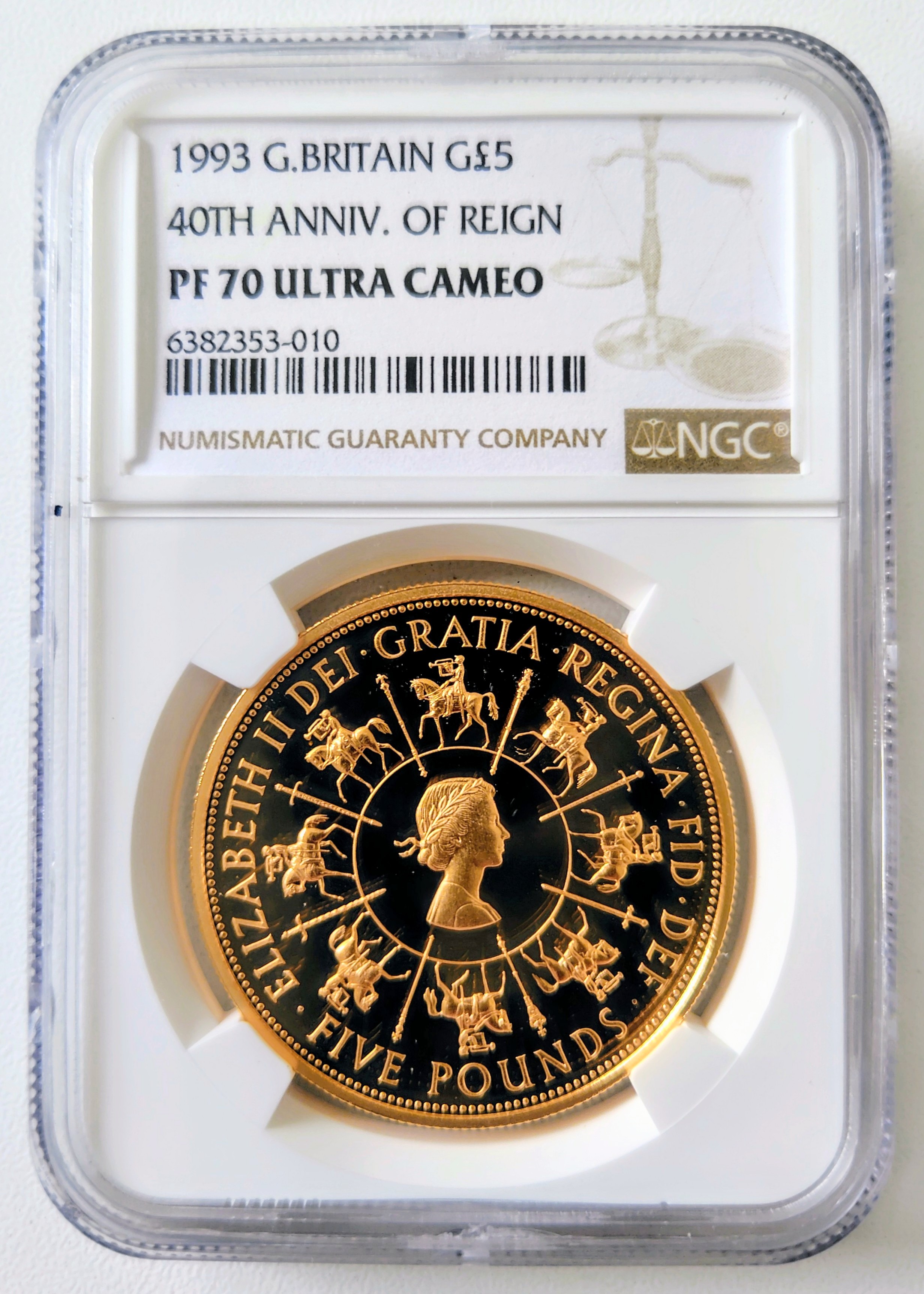 1993年 英国 イギリス 女王 エリザベス2世 戴冠40周年 5ポンド プルーフ 金貨 NGC P…